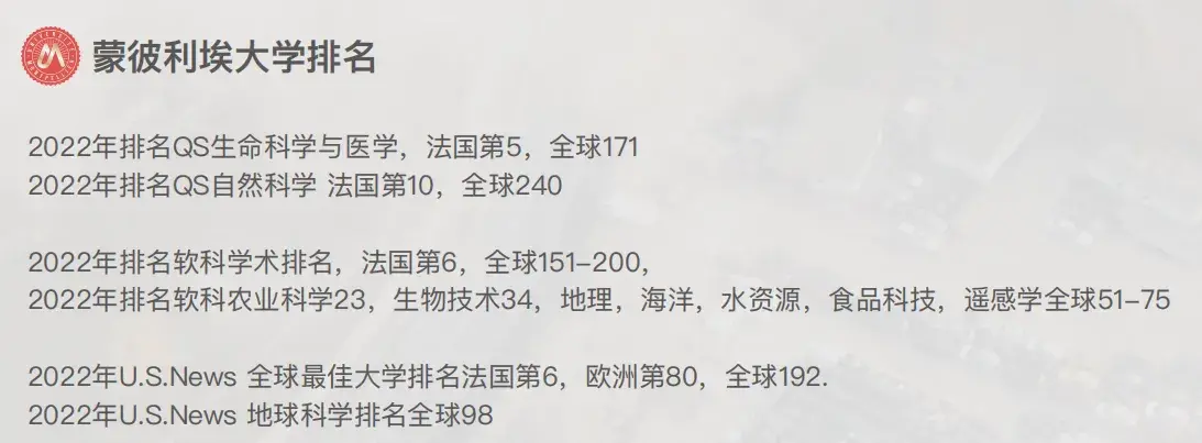 蒙彼利埃大学拥有近800年的建校史,是中国教育部认可并推荐的法国公立大学。蒙彼利埃大学与多家法国国家和国际研究机构保持着紧密的关系,并与英国剑桥大学、牛津大学、德国哥廷根大学齐名,是欧洲出名的大学联盟“科英布拉集团”成员之一。