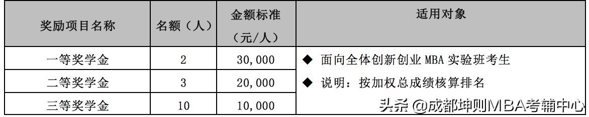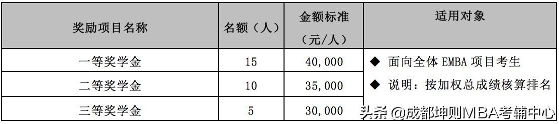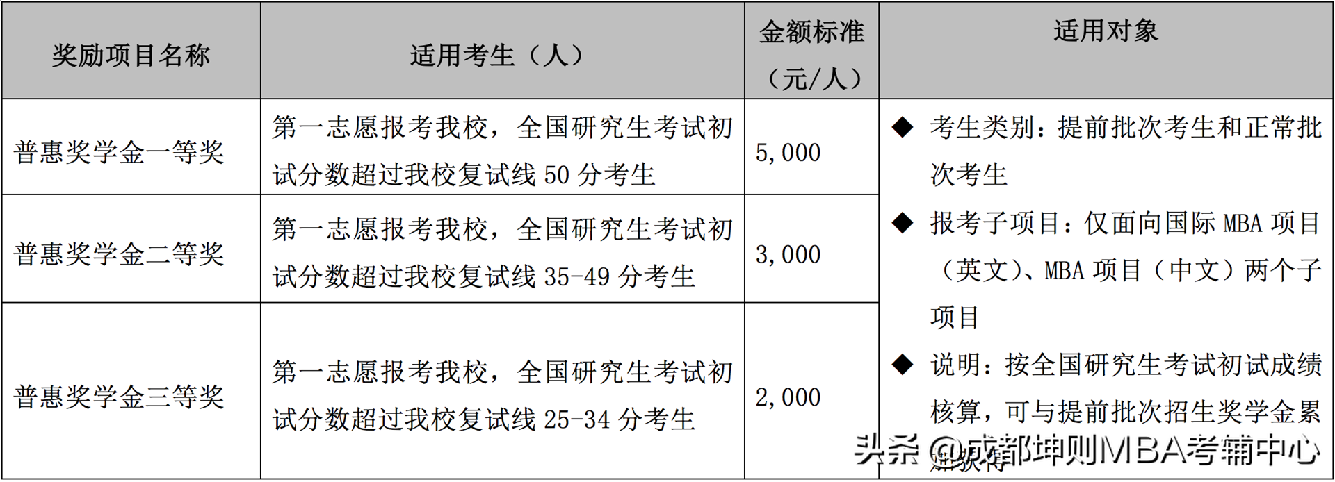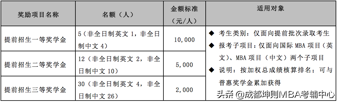 设立四种类别入学奖学金,以资鼓励报考我校MBA/EMBA项目、全国研究生考试初试分数成绩优秀、提前批次招生面试表现出色的考生。