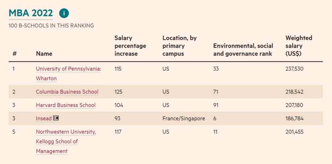 金融时报上周更新了2022年度MBA专业前百的排名。这波排名主要是美国学校占据绝对优势,靠前的基本都是美国学校。英国最强的伦敦商学院已经跌破前三,到了第八的位置。