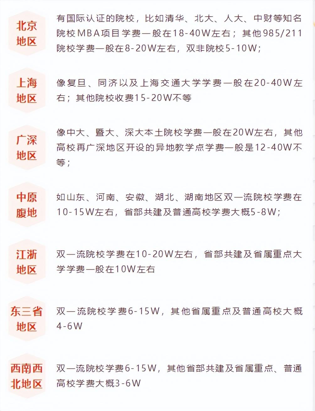 虽然都是mba项目,但是不同院校、不同项目类型收费都会有所不同,985、211、双一流院校要比双非院校、市属重点院校、省部共建院校要高,一线城市及经济发达地区的院校要比其他城市及地区的收费高;非全日制mba要比全日制mba收费更高,目前读一个mba最新学费标准如下: