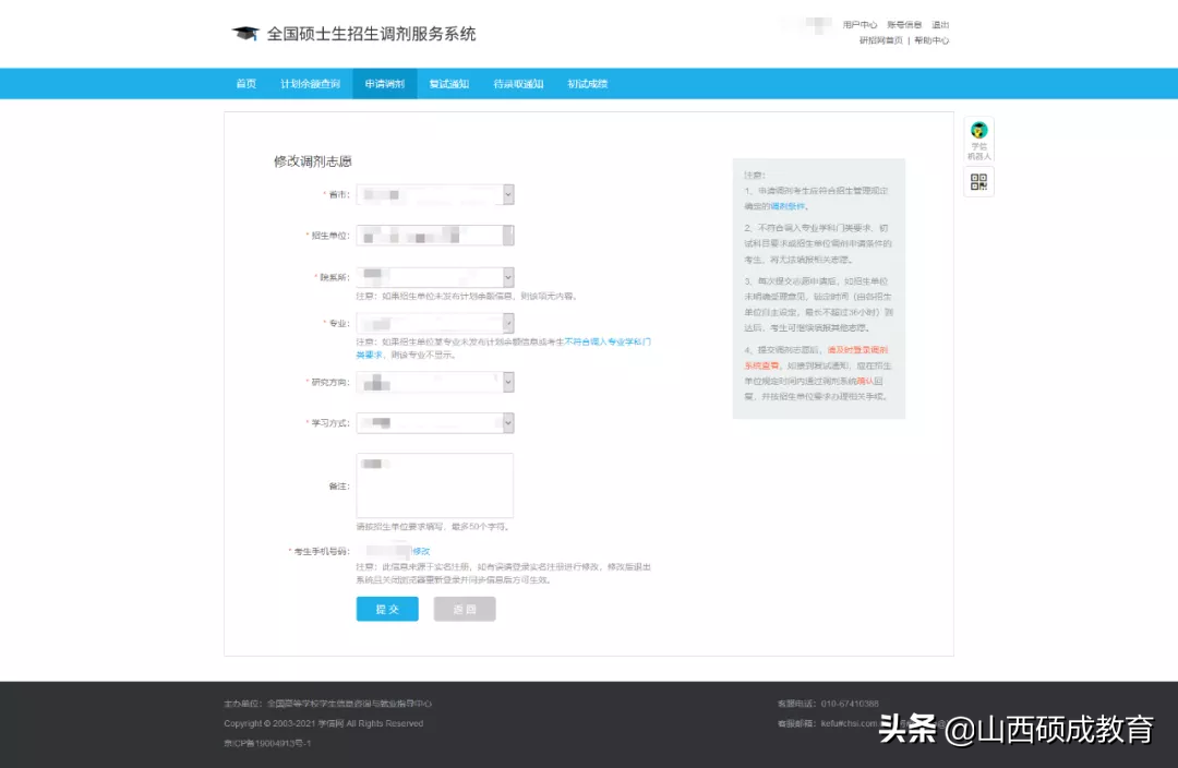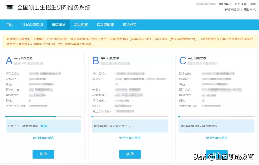 提交后的调剂志愿在36小时内不允许修改(两个志愿单独计时),以供招生单位下载志愿信息和决定是否通知考生参加复试。36小时后,考生可以修改调剂志愿。