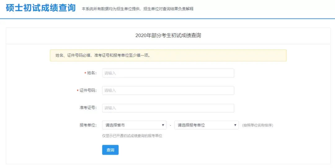 注意,不是所有的院校都能在研招网查询,只有在研招网上传分数的院校可以查。所以在研招网查不到分数的同学不要慌张,按照所报院校规定的查询方法即可。