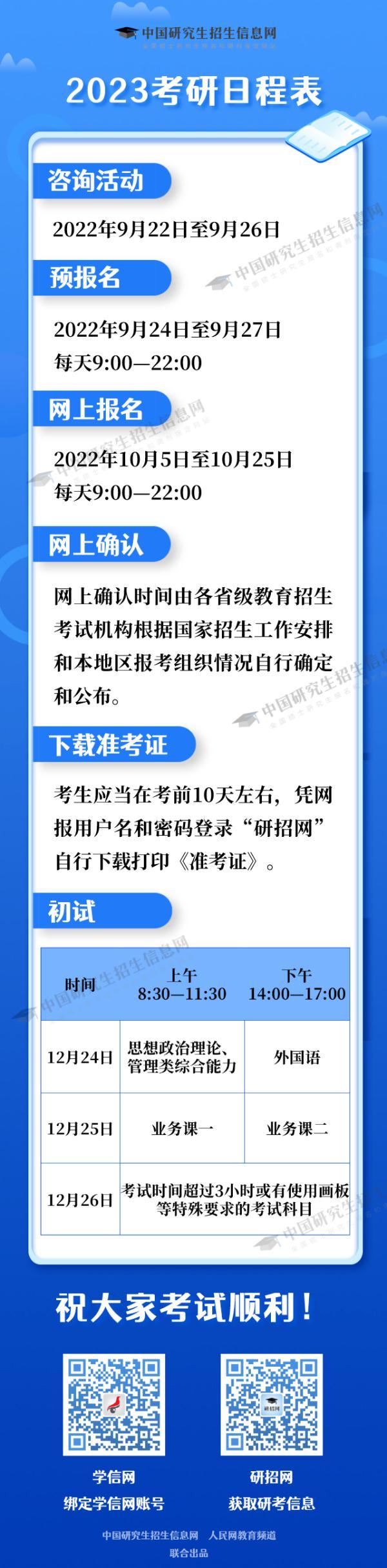 2023年全国硕士研究生招生考试初试定于2022年12月24日至25日,考试时间超过3小时或有使用画板等特殊要求的少数考试科目安排在12月26日。