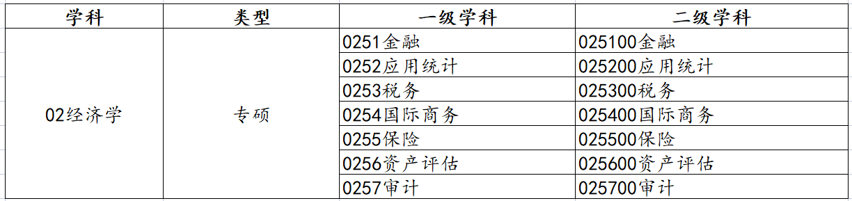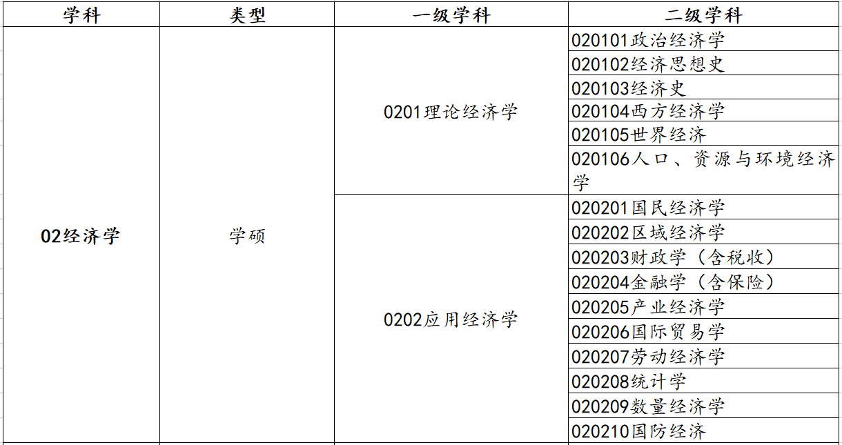 经济学下既有学硕,又有专硕。随着国家对专业型人才的需求增加,经济学专硕的热度也持续走高。学硕和专硕对应的一级学科和二级学科如下表所示: