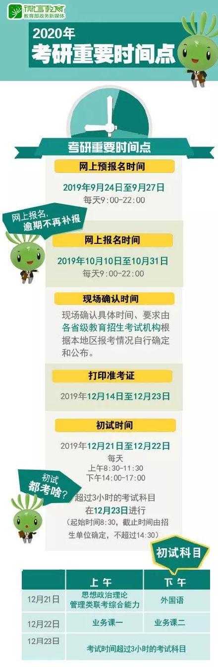 【2020年考研时间公布,这些时间点很关键】民生视角要考研的同学们注意啦,2020年全国硕士研究生招生考试公告已出炉。考试初试时间为2019年12月21日-22日(每天上午8:30-11:30,下午14:00-17:00)。还有哪些重要时间点?戳图了解☟@教育之江