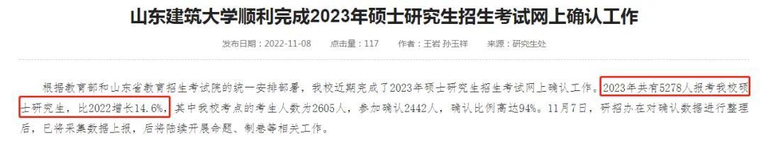 山东建筑大学近期完成2023年硕士研究生招生考试网上确认工作。2023年共有5278人报考学校的硕士研究生,比2022年增长14.6%。