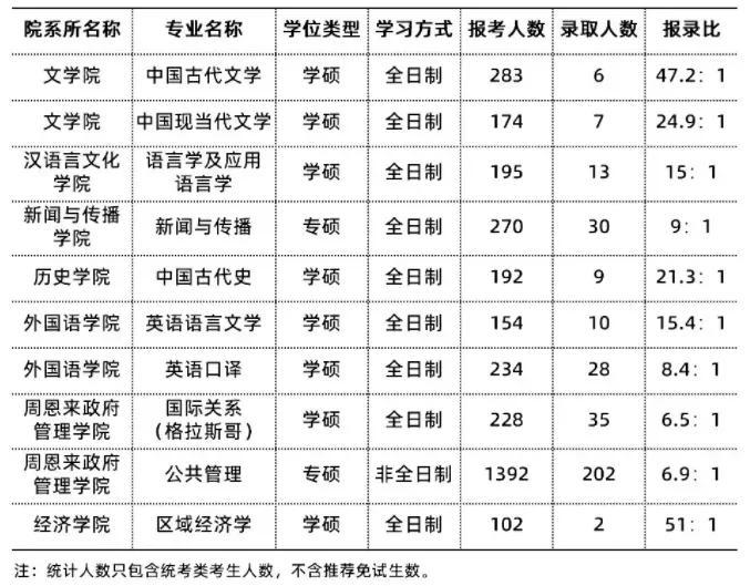 此前,南开大学公布2022年硕士研究生报考录取人数数据,中国古代文学、区域经济学等专业竞争较为激烈,分别为47进1,52进1。此外,工商管理(专硕)专业报考人数突破千人,总计高达1220人。