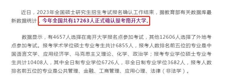 16日上午,南开大学官方公众号发布消息,2023年全国硕士研究生招生考试报名确认工作结束,据教育部有关数据库最新数据统计,今年全国共有17263人正式确认报考南开大学。