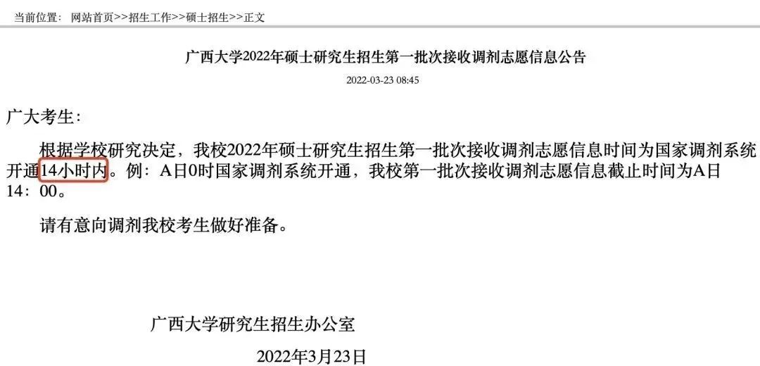 《2022年硕士研究生招生工作管理规定》要求,高校调剂系统开放时间不得低于12小时。但调剂系统一开放,留给我们调剂的时间就不多了,比如广西大学前几天发布的公告就显示该校调剂系统开放时间仅14小时!所以在系统开放之前,找好目标院校非常重要!