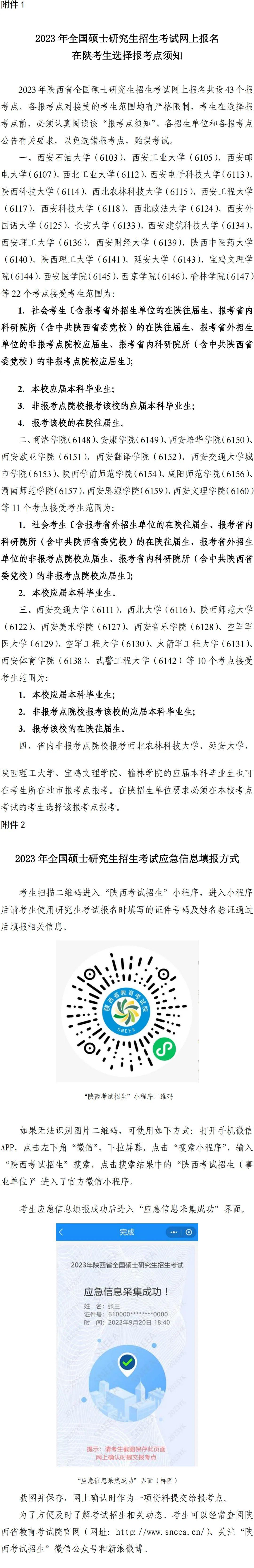 为了有效应对突发疫情,需补充采集考生应急信息。请考生于10月28日至11月5日登录“陕西考试招生”小程序(填报方式见附件2)填报个人应急信息。应急信息填报成功后将“应急信息采集成功”界面截图并保存,网上确认时作为一项资料提交给报考点。