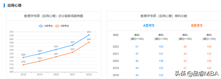 可以看出,近几年分数线成整体上升趋势,与应用心理学相同,2022年国家线上涨14分,单科线分别上涨4分、6分。