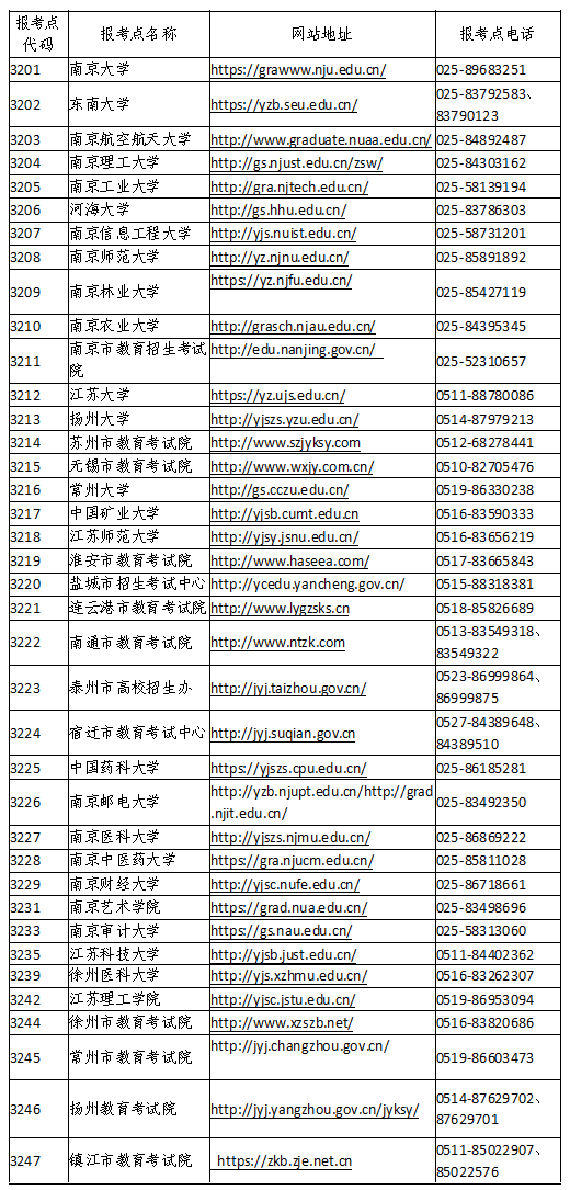请考生认真查阅各报考点网站相关内容,如仍有疑问可向各报考点咨询。2022年江苏省硕士研究生招生考试报考点网址和*如下表: