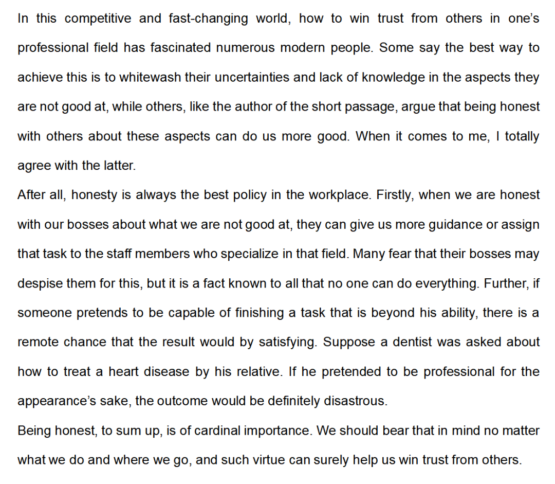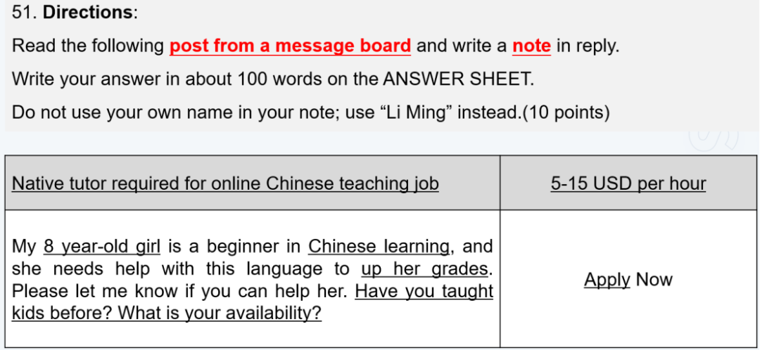 评点:大纲中并未提及便条写作,但样题里指令关键词中却出现了“note”,所以,大家可按书信格式撰写即可。有没有觉得这就是一篇标准的求职信?