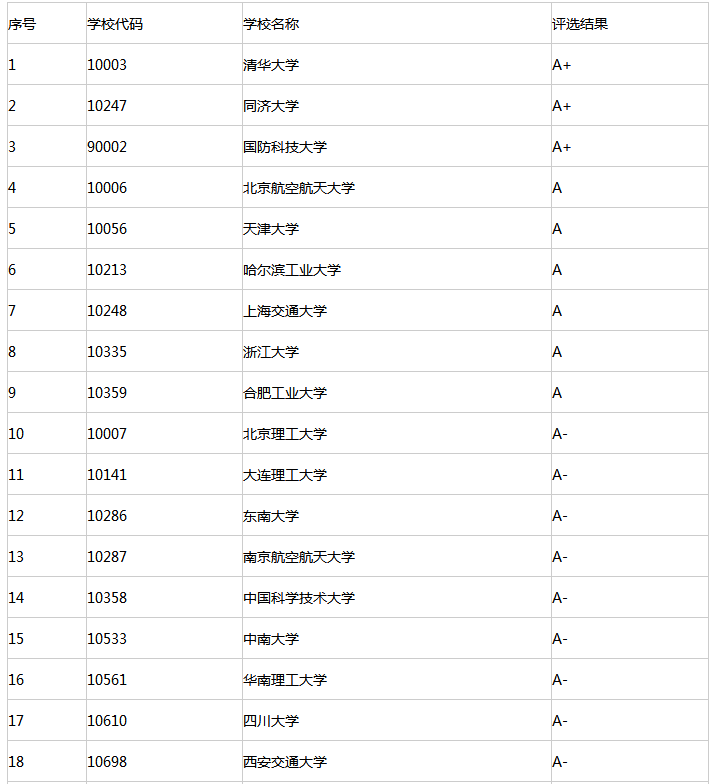 清华大学、西安交通大学、北京航空航天大学、上海交通大学、浙江大学、天津大学、华中科技大学、大连理工大学、哈尔滨工业大学、同济大学、武汉大学、东北大学、武汉理工大学、西北工业大学