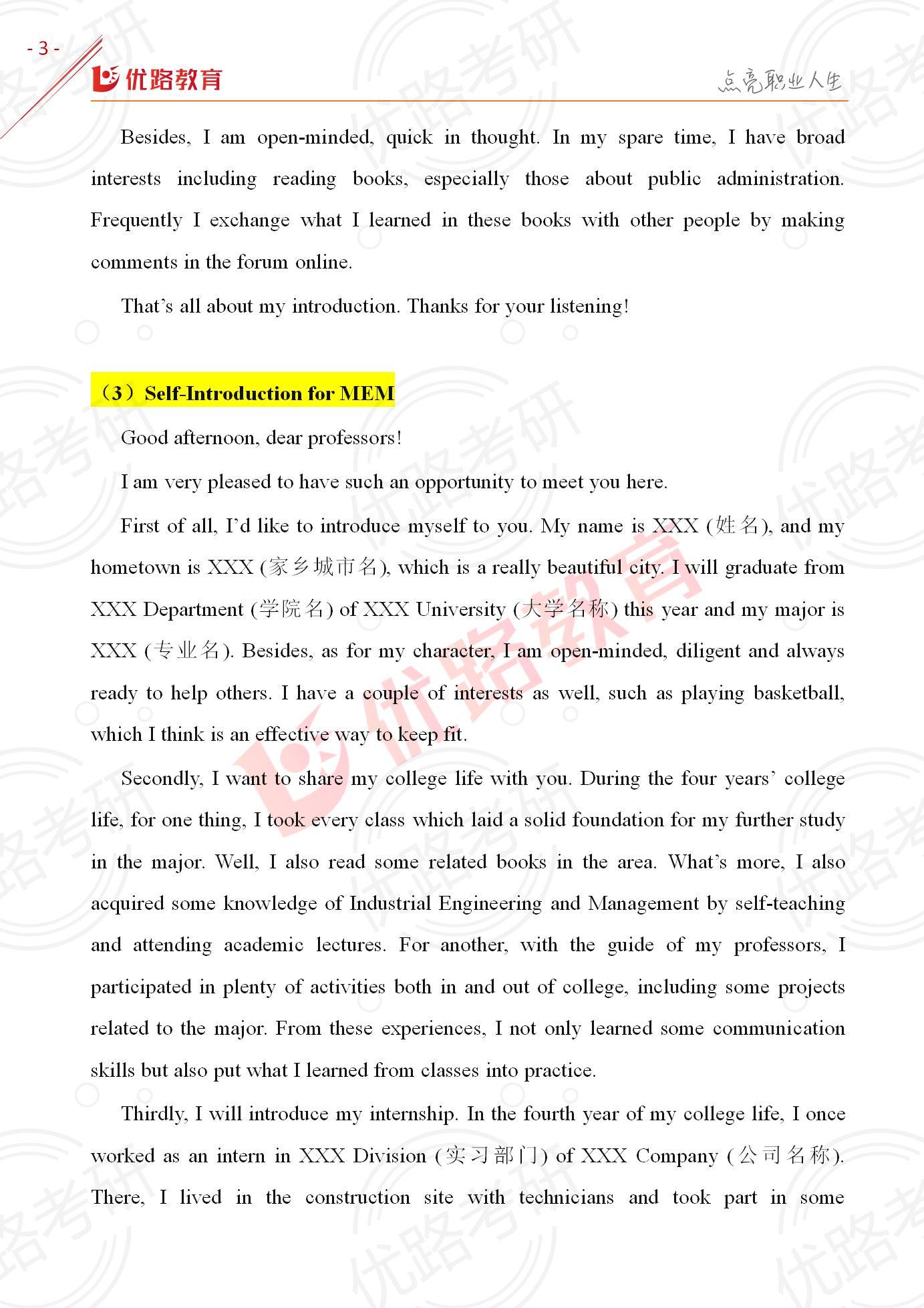 优路考研整理了考研复试英语口语的模板,考生可以保存练习哈~