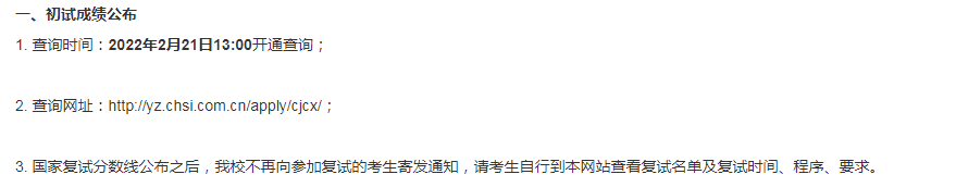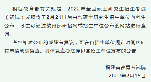 2022年全国硕士研究生招生考试(初试)成绩将于2月21日后由各硕士研究生招生单位向考生公布,考生可通过教育部研招网或招生单位公布的网站进行查询。