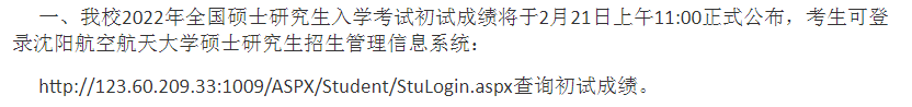 我校2022年全国硕士研究生入学考试初试成绩将于2月21日上午11:00正式公布,考生可登录沈阳航空航天大学硕士研究生招生管理信息系统,查询初试成绩。