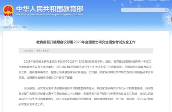 记者从教育部获悉,2023年全国硕士研究生招生考试将于2022年12月24日至26日举行。
