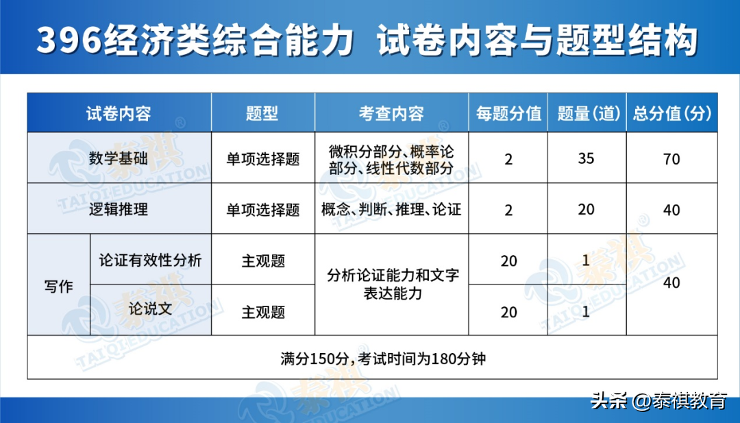 其中396经济类综合能力包括:数学基础、逻辑推理、写作(论证有效性分析、论说文)三大部分,满分为150分。