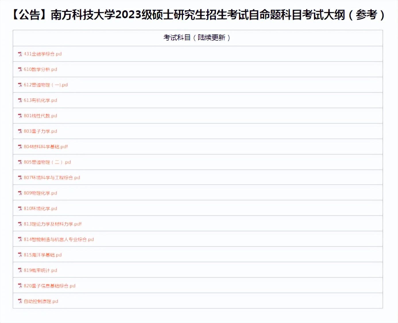 南方科技大学已经公布10余个自命题科目考试大纲,如金融学综合、数学分析、普通物理、有机化学,更多科目持续更新。报考专业已经公布的,可以关注起来,对照复习了。