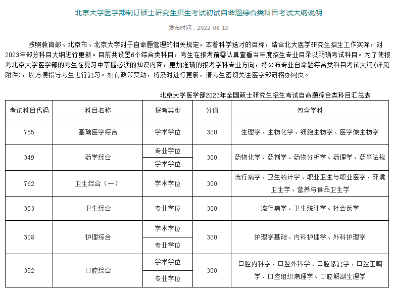 目前,北京大学医学部更新了6个综合类科目考试大纲,包括基础医学综合、药学综合、卫生综合、护理综合、口腔综合等。大家近期记得持续关注医学部研招办网页。