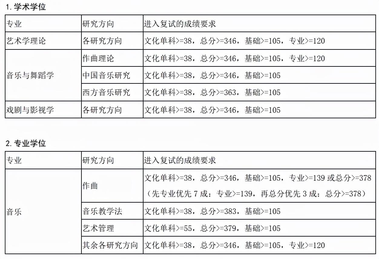 上海音乐学院 2021 年硕士研究生招生进入复试的初试成绩要求