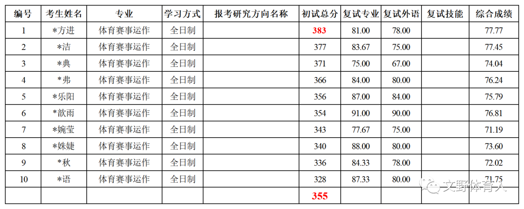 体育赛事运作共拟录取10人,初试最高分383分,最低分328分,平均分355分。