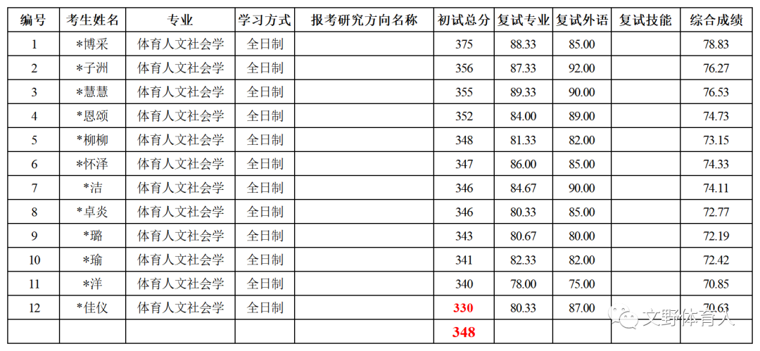 体育人文社会学共拟录取12人,初试最高分3758分,最低分330分,平均分348分。