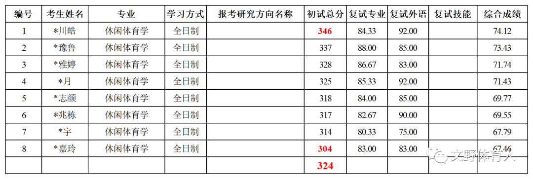 休闲体育学共拟录取8人,初试最高分344分,最低分304分,平均分324分。