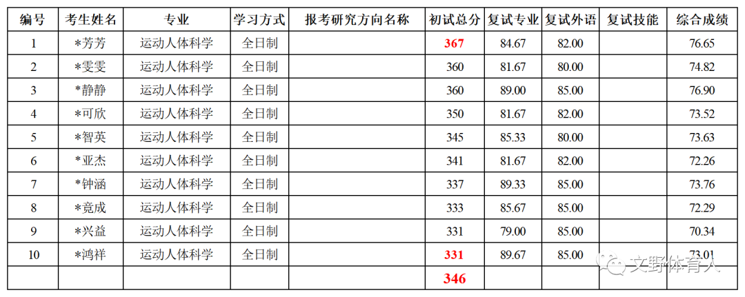 运动人体科学共拟录取10人,初试最高分367分,最低分331分,平均分346分。