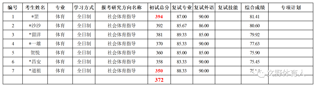 社会体育指导共拟录取7人,初试最高分394分,最低分350分,平均分372分。