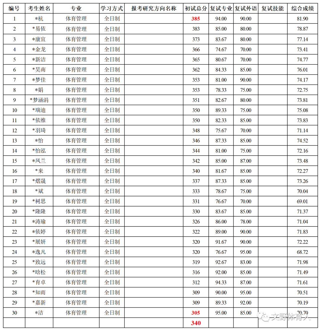 体育管理共拟录取30人,初试最高分385分,最低分305分,平均分340分。(备注:不包括退役大学生士兵计划)