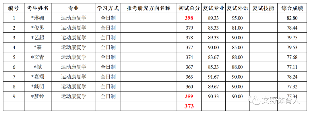 运动康复学拟录取9人,初试最高分398分,最低分359分,平均分373分。(备注:不包括退役大学生士兵计划)