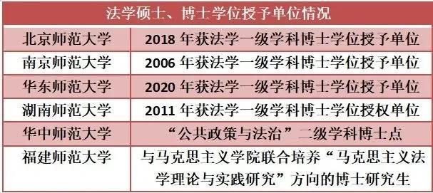 南师大是全国第二批获得法学一级学科博士点的高校,仅晚于北大、人大、法大、社科院、武大和西政,在师范院校中,2006年的时间也是远远早于其他师范院校。而湖南师范大学也是较早获得法学一级学科博士点的院校,北师大和华东师大则是近几年刚获得,也反映了近几年两所法学院的发展势头较猛。而华中师大和福建师大则暂时没有法学一级学科博士点。