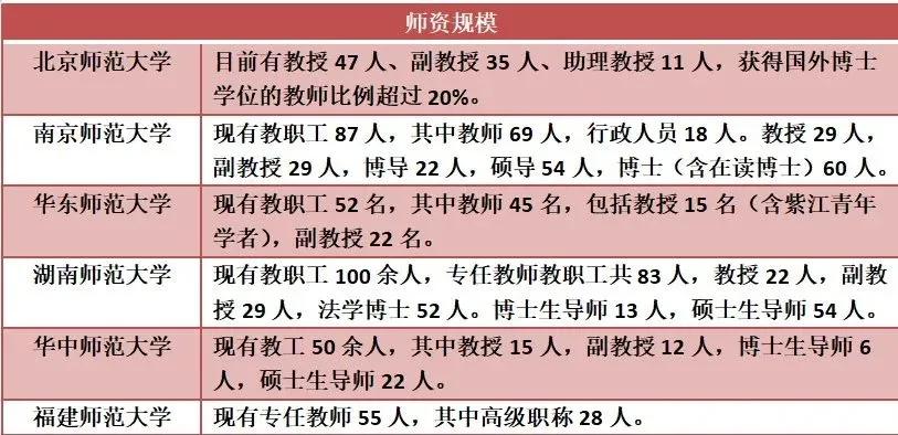 师资规模也能一定程度反映出一所法学院的办学规模和水平,据的最新资料介绍,湖南师大和北师大教职工数量是相对较多的,而华东师大、华中师大和福建师大相对较少。另外,北师大法学院有47名法学教授,教授人数是以上师范院校法学院中最多的。