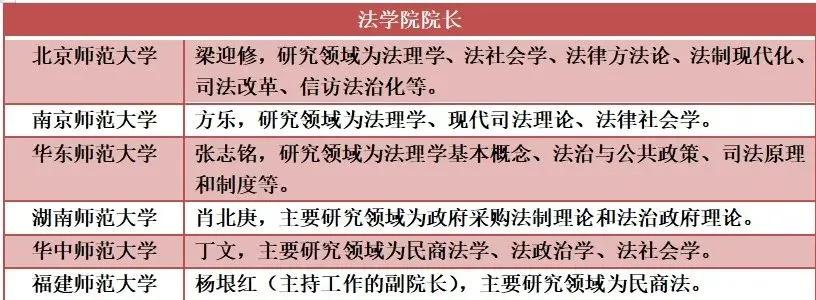 六所师范大学的院长(其中福建师大为副院长)主要研究领域出奇的一致,四位院长研究法理学,两位院长研究的是民商法学。各位院长的学历背景都非常扎实,梁迎修院长是法大的本硕,北大博士。方乐院长是中南财经政法的本科,南师大的硕博。张志铭院长为北大本硕,社科院的博士。肖北庚院长是武大博士、社科院博士后。而丁文则是湖北师范大学的本科、武大的硕博。