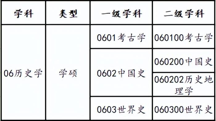 本科学历史学相关专业或目标专业为历史学相关专业,首先确定报考专业学科为历史学,历史学下的一级学科及一级学科下所属二级学科如下表所示: