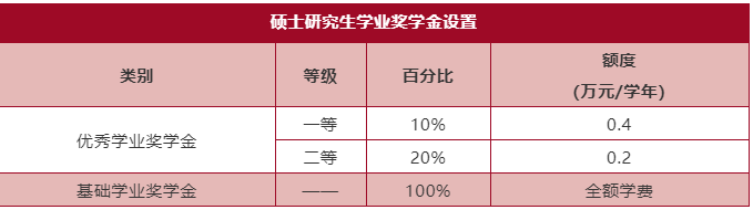 研究生学业奖学金分为基础学业奖学金和优秀学业奖学金,用于奖励纳入全国研究生招生计划,具有中华人民共和国国籍的武汉大学在籍且基本学制年限内的全日制非定向就业研究生,少数民族高层次骨干人才计划和高层次人才强军计划定向研究生。基础学业奖学金奖励标准为每生每年全额学费,优秀学业奖学金评选比例为基础学业奖学金参评人数的30%。具体设置及标准如下: