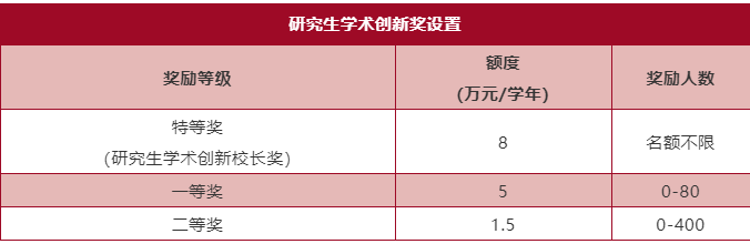 研究生学术创新奖以“高端引领,鼓励拔尖”为主要目的,是对研究生学术科研水平及创新能力的综合评定,具体设置及标准如下: