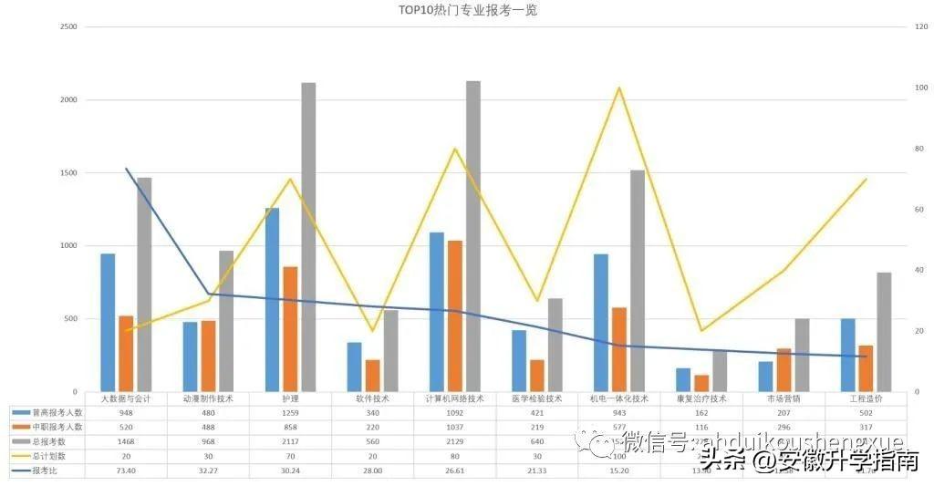 上图中10个专业的报考比(专业报考人数/专业招生计划)均大于10,最高73.40,最低11.70,报考比对录取结果有着最为直接的影响,从一定程度上,报考比意味着竞争激烈程度,从《合肥职业技术学院2022年分类考试招生各专业录取分数线一览表》各专业普高、中职分数线我们可以看出,录取不是简单的比较录取成绩,而是基于招生计划、录取原则(我校在章程中已明确录取遵循“志愿优先”原则)、录取成绩等多种因素的综合结果。