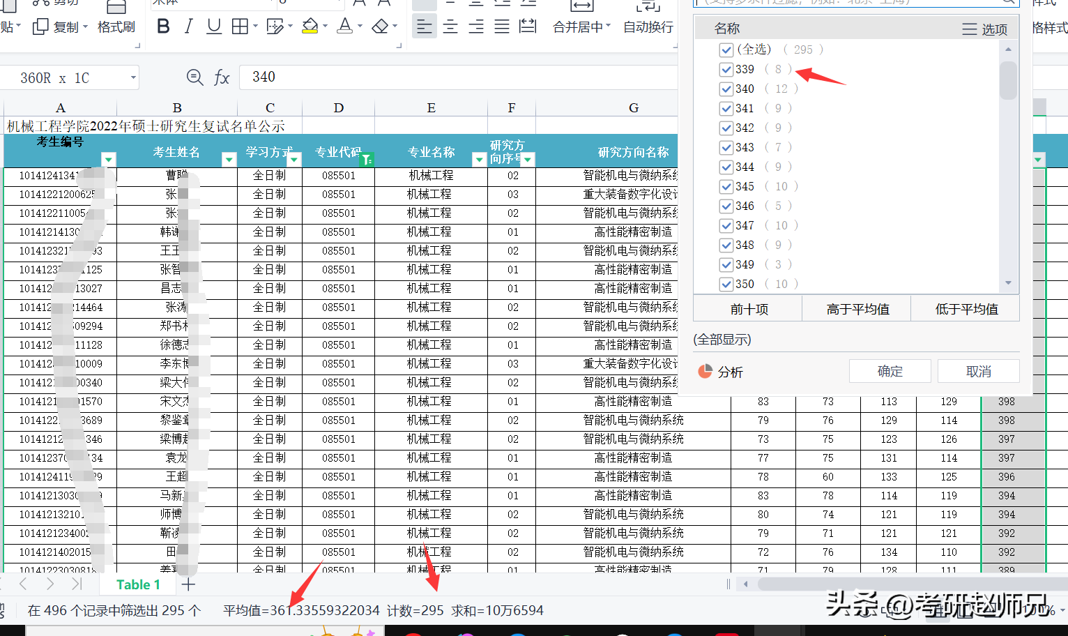 一志愿总共进入295人,最低分339分,平均分361分