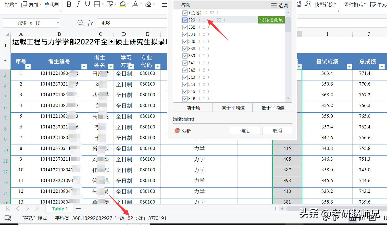 最终实际录取82人,复试刷掉32人,实际录取最低分329分,平均分368分