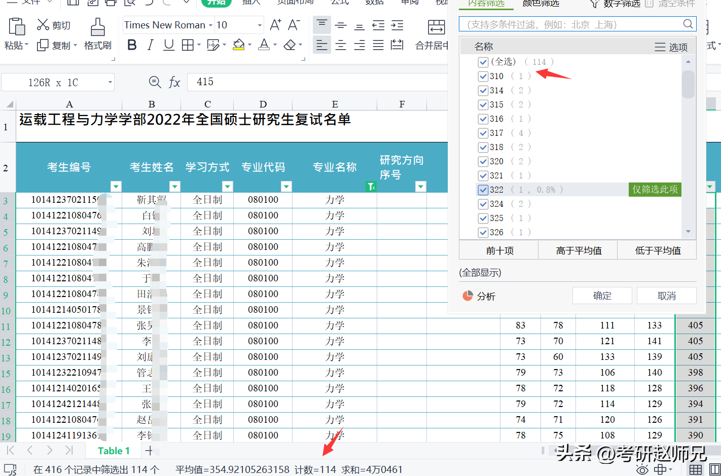 0801000力学学硕一志愿总共进入114人,最低分310分,平均分354分,最高分415分。