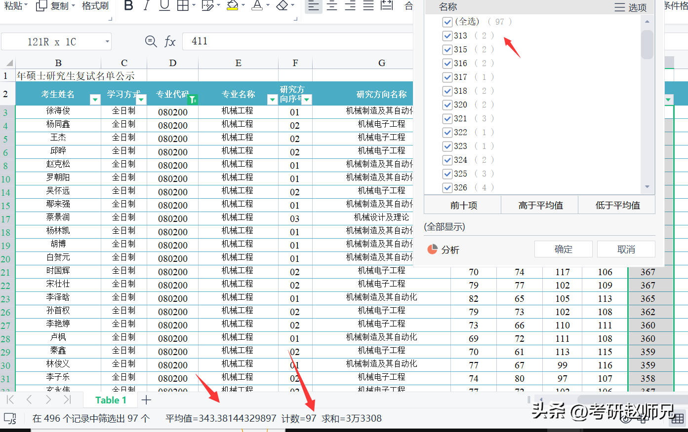 一志愿进入97人,最低分313分,平均分343分。
