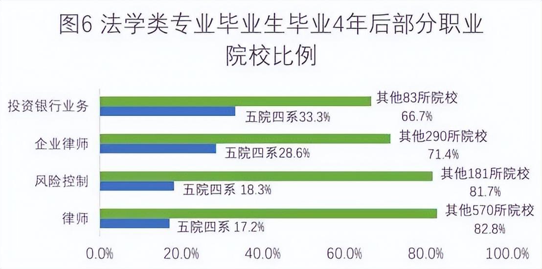 此外,院校背景情况也是从事高薪职业的重要影响因素(图6所示),学信网学职平台调查显示,在投资银行业务、企业律师、律师和风险控制岗位中,五院四系(中国政法大学、西南政法大学、西北政法大学、中南财经政法大学、华东政法大学、北京大学法学院、中国人民大学法学院、吉林大学法学院、武汉大学法学院)的毕业生比例分别为33.3%、28.6%、18.3%、17.2%,与院校数量比例差异大。