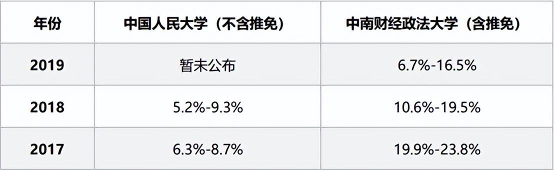 此外,在全国高校中,法学排名靠前、整体实力较强的研究生院校报考人数较多,且录取分数较高。比较有代表性的有中国人民大学、中南财经政法大学等(如表1所示)。