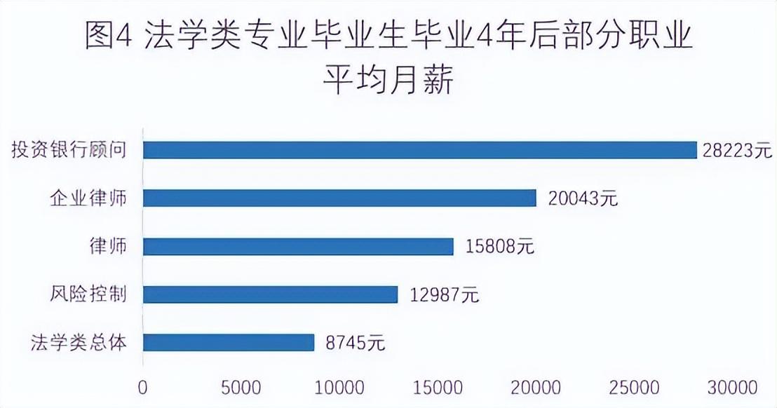 综合法学类人才毕业4年后的就业方向和平均月薪来看(图4所示),在法学类专业毕业生从事的所有职业中,投资银行顾问岗位月收入最高,平均月薪达28223元,紧随其后的是企业律师、律师等;相较于毕业0-3年的职业薪资,毕业4年后法学类人才薪资基本呈现多倍增长的趋势。