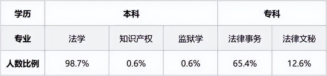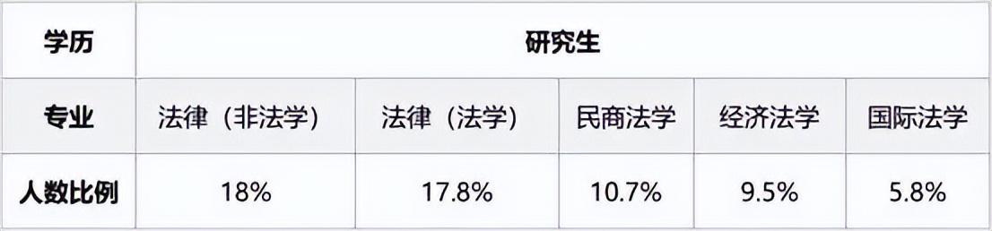在学信网学职平台的职业调查中,有4.2万人毕业于法学类专业。学历分布为专科毕业生占比20.4%,本科毕业生占比65%,研究生毕业生(包含硕士、博士)占比14.6%。各学历层次毕业人数较多的部分专业和相对应的人数比例如表2、表3所示。