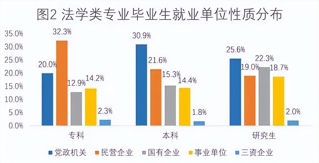 综合各学历层次毕业生就业的企业类型来看(图2所示),法学类人才就业单位性质多元。专科毕业生以民营企业为主;本科生在党政机关和民营企业就业比例最高,共计占比52.5%;研究生就业平均分布在党政机关、民营企业、国有企业、事业单位中。