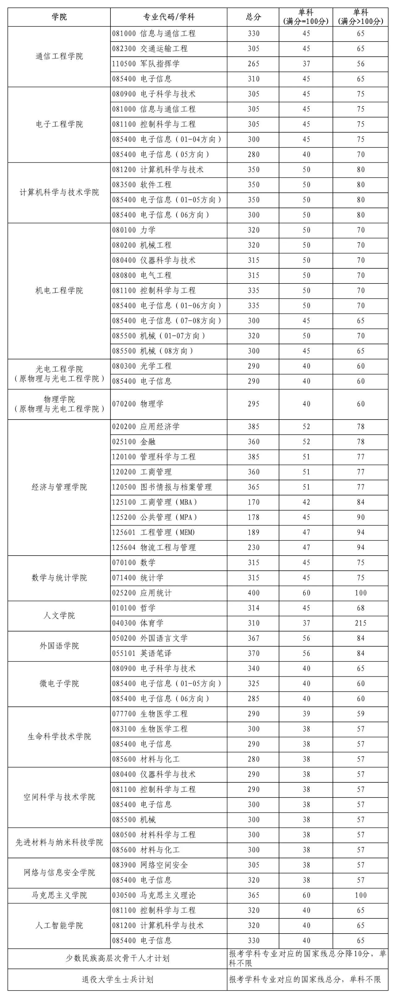 西安电子科技大学2022年硕士研究生招生考试复试分数线